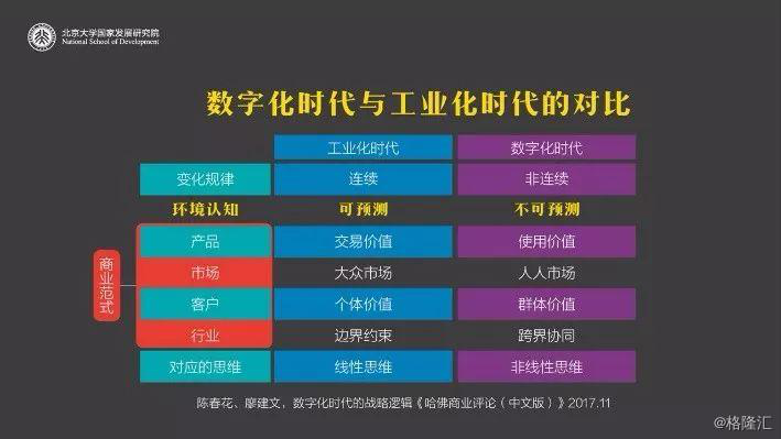 我们对断点、突变、不连续性要有非常强的敏感性,如果没有这样的敏感性就无法跨越时代变革的鸿沟。数字化时代与工业时代相比,我们最擅长的产品、市场、客户、行业四个基本商业范式都已发生改变;工业时代设计和生产产品只关心交易价值(销售收入、利润等交易变量),而在数字化时代,设计和生产产品关心的是使用价值(如何能更好地满足顾客需求或者创造顾客需求)。从市场的角度看,过去追求扩大市场占有率,今天则是人人都会成为市场,市场趋于无限细分。